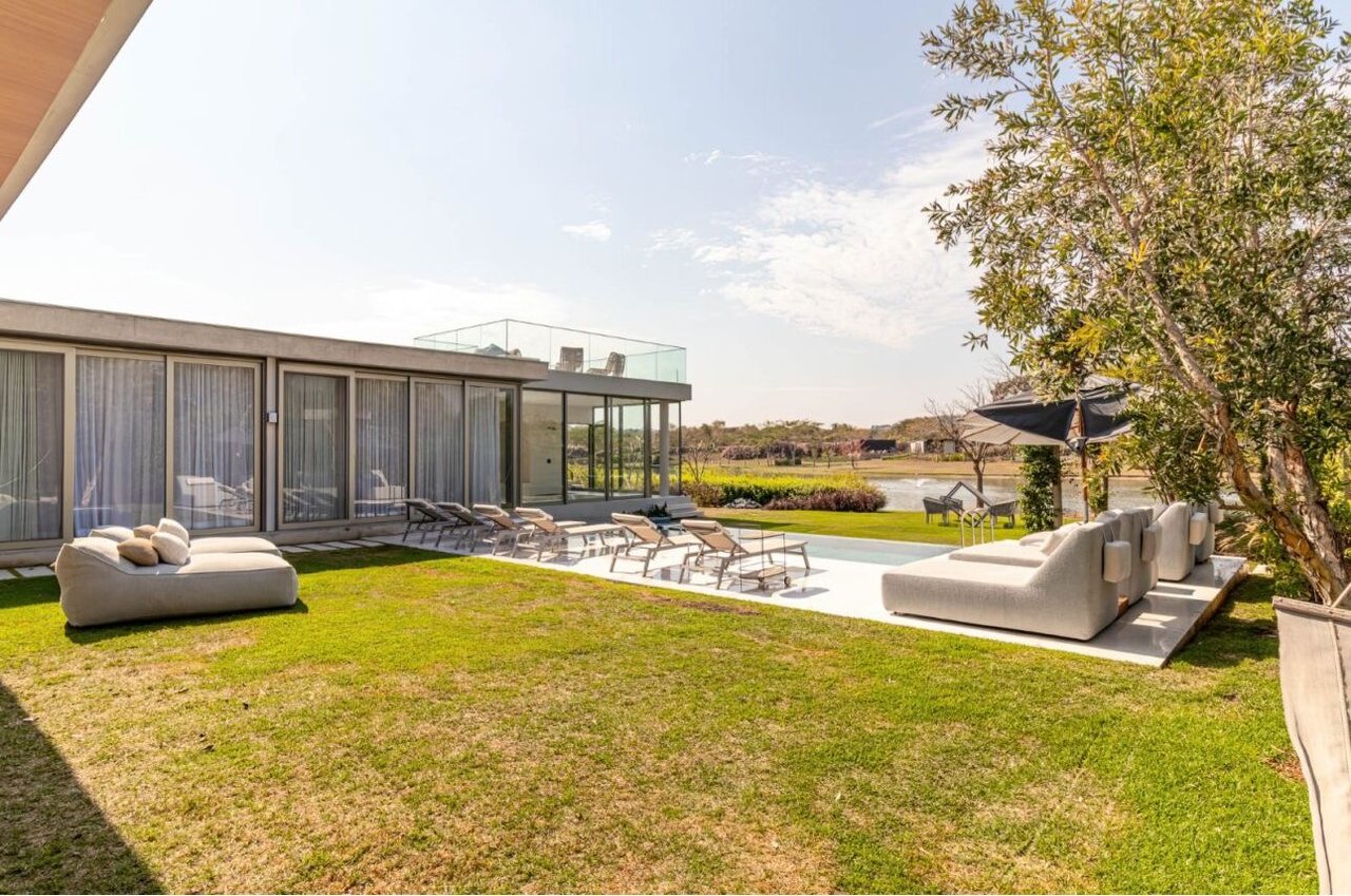 A casa foi planejada para oferecer vista panorâmica para o lago, trazendo serenidade e beleza em cada detalhe.
